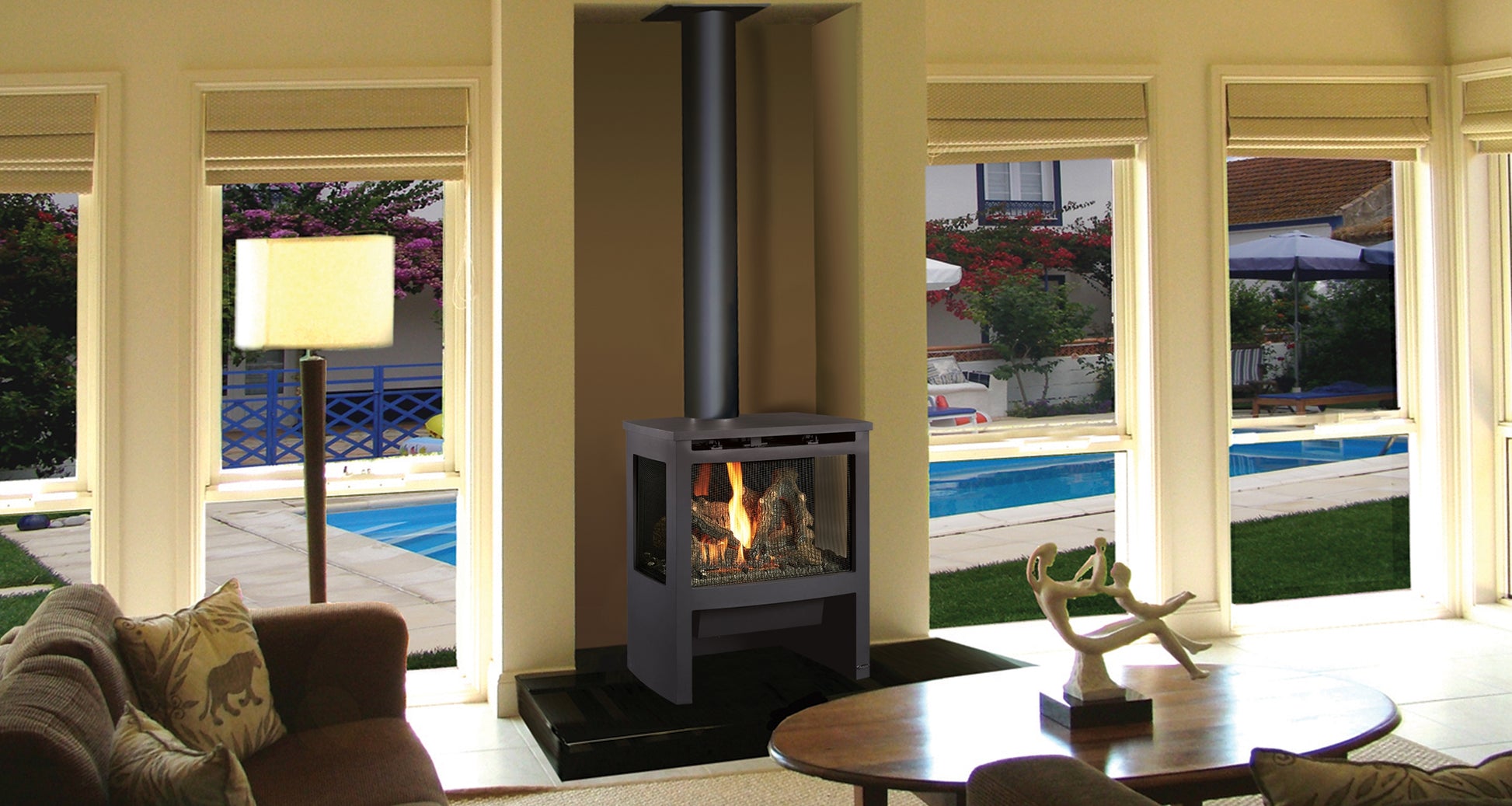 Get ready to elevate your home heating experience with the stunning Cypress™ Gas Stove! This incredible masterpiece features a breathtaking open three-sided design, complete with a large wrap-around ceramic glass viewing area that offers an unbeatable view of the award-winning Ember-Fyre® log set from every angle in your room!